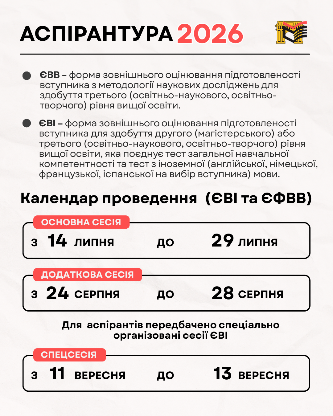 Відповідно до наказу МОН від 24.12.2025 №1701, цьогоріч передбачено проведення основних і додаткових сесій тестування. Основні проходитимуть протягом 14–29 липня; додаткові — 24–28 серпня.